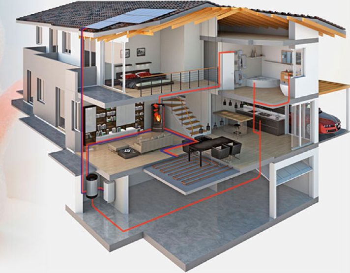l’air chaud est canalisé dans des gaines isolées afin de le rejeter dans d’autres pièces au rez-de-chaussée ou à l’étage.